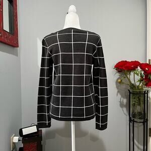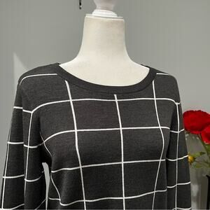 New Stunning Wool Windowpane Plaid Grid Contrasting Print Gray and White Scoop Crew Neck Knit Sweater with Long Sleeves by Ann Taylor. Slightly Oversized Semi Loose Fit. Mid Weight. Some Stretch. Size Medium.