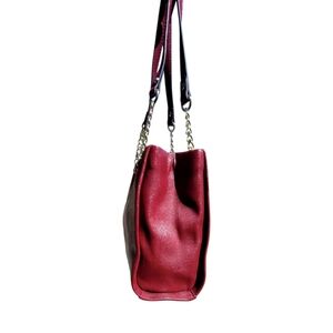 Anne Klein shoulder bag. Features a deep wine red color. Gold chain accents add elegance. picture dose this bag no justice, much more beautiful in person, love this bag Height: 8.5" Width: 12" Depth: 3.5" Handle Drop: 9.5" Anne Klein Handbag Purse Double Handle Lion Logo Charm Chain strap detail gold Tone Hardware Metal feet at bottom Magnetic closure 2 Interior zip pockets 2 Interior slide in pockets