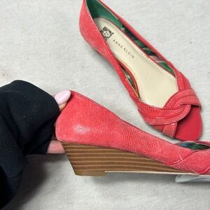 Classic Anne Klein leather wedge sandals in a chic pink with braided front and peep toe — comfy, stylish, and perfect for summer outfits or dressy events. Brand new, never worn. Questions welcome — my goal is for every customer to be fully satisfied with their purchase!
