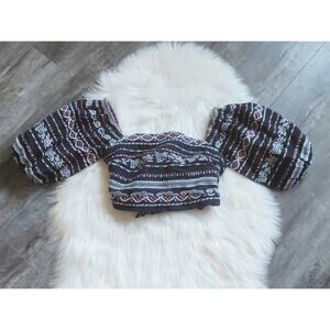 Timeless unique detail all over. Hook closure on backside. Nice material, not thin. Super sharp. Acrylic, cotton. Pullover styling. Machine wash.