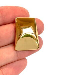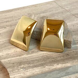 Featuring gold metal, in an angled and slightly domed rectangle design, these bright earrings are sure to make a statement. Light catching with a shiny smooth surface, these would be a great addition to your closet. These are well made and have a nice weight to them, but not too heavy for everyday wear.