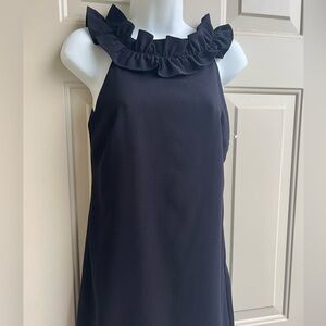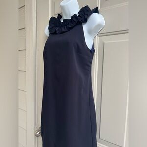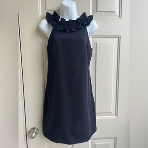 Gorgeous navy blue mini dress by Larke for Anthropologie. Features delicate ruffle details, a beautifully textured fabric, and a flattering petite fit.