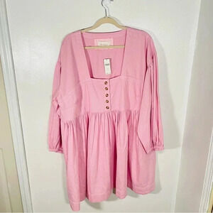 NEW Anthropologie Long-Sleeve Square-Neck Denim Babydoll Mini Dress Pink Preppy