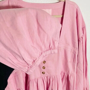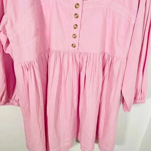 Description: Pullover style; square neck with button front chest detailing; babydoll style; can be worn as a mini dress or tunic; bohemian festival denim; long sleeve; barbiecore pastel.