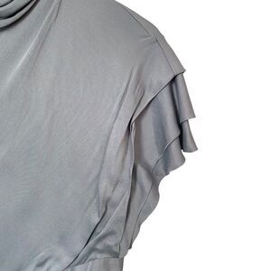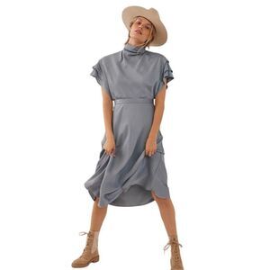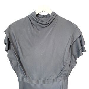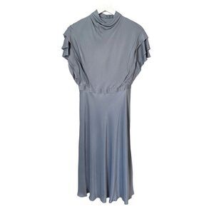 Finished with ruffled sleeves, this sleek midi dress is a feminine essential for the season. Mock neck and back zip. Wedgewood Blue color. Material is Viscose. New with Tags. Size 4