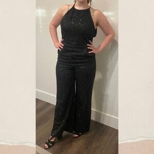 This jumpsuit is perfect for a wedding, cocktail party, or any formal occasion. It also works great for a casual day out or a night on the town. The sequin textured accents add a touch of glamour to the solid black pattern, making it an ideal choice for a disco-themed party. Hand wash only for proper garment care.