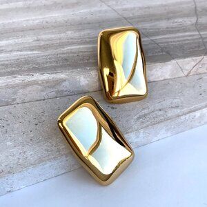 Featuring gold tone metal in a wavy edged rectangle design, these bright earrings are sure to make a statement. Light catching with a shiny smooth surface, these would be a great addition to your closet. These are well made and have a nice weight to them, but not too heavy for everyday wear.