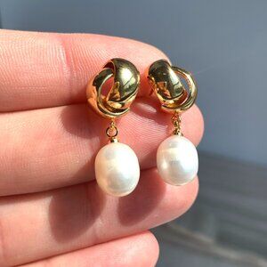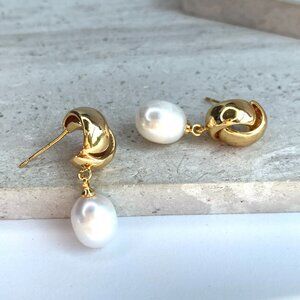 NEW~ Anthropologie Shashi Gold Overlap Stud & Genuine Pearl Dangle Earrings