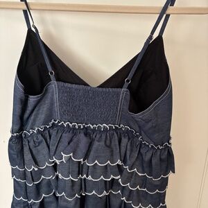 This dress is party ready with a cascade of ruffled, scalloped tiers. The fabric holds its shape and drapes well. Contrast white stitching on scalloped tiers and bra top.