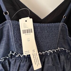 This Geisha Designs for Anthropologie dress is NEW WITH TAGS. Size XS. Dark blue polished denim-look fabric is 40% Cotton, 33% Polyester, 27% Rayon. Fully lined in 100% Cotton. Shaped and padded bra top with ajdustable straps and smocking in back. Size zip.