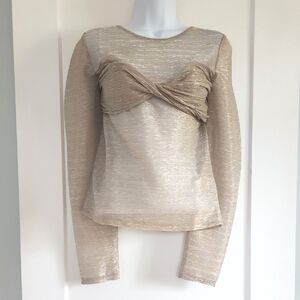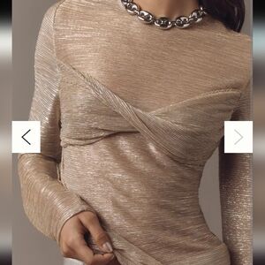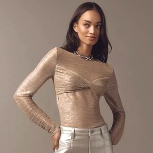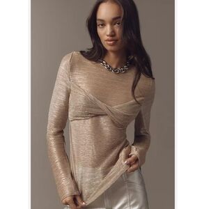 Adorable and sexy sheer twist top with metallic threading from Anthropologie. Brand new with tags from Anthropologie! Pit to pit 17" length 24" size medium 55% polyester, 45% metallic thread Pullover styling Hand wash cold Imported This was not a thrifted item. It was purchased 2025 from Anthropologie. 🌼I LOVE offers! ♡ 🌼20% off your total purchase of 3+ items 🌼 Pet friendly home 🌼 Non Smoking home
