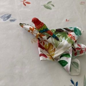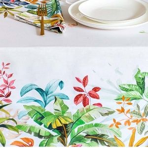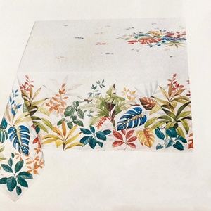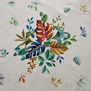 Beautiful new Antilles tropical 70 round cotton tablecloth with colorful leaves around the border and a bouquet of leaves in the center. The matching napkins are sold separately.