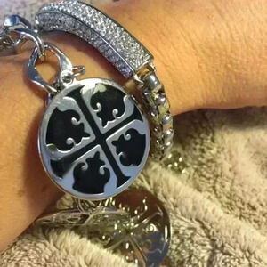 Gorgeous charm bracelet with Silvertone and Silvertone/ black charms.