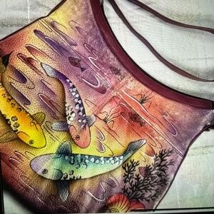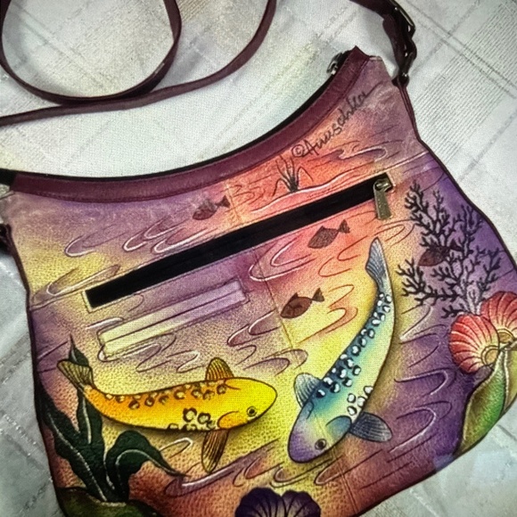 This is an authentic Anuschka handbag, hand painted Koi swim on both sides of the supple leather beauty. Zip close with 2 key lanyard to keep your keys easy to find. One outside zip, two outside slip pockets. Beautiful!! I never used it.