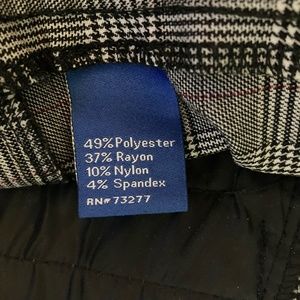 These are NWOT Apt. 9 Plaid Pants in black grey, white and burgundy/red. There are two front pockets, two faux back pockets and a stretch waist. Really cute, Business/ Casual, Classy. Size: 10P. 49% polyester, 37% rayon, 10% nylon, 4% spandex.