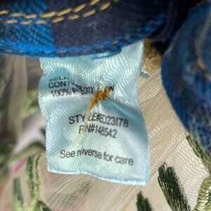 Artisan-designed ensemble featuring a distressed blue plaid denim jacket paired with an embroidered floral mesh skirt.