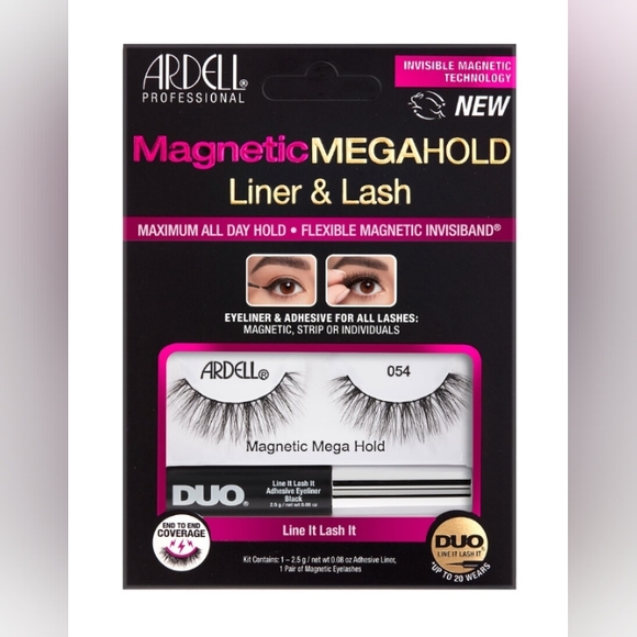 Experience the next generation of magnetics for stunning lashes that hold tight with no visible magnets in sight! Ardell’s Magnetic MegaHold innovation provides powerful end-to-end magnetic coverage to secure lashes all day with maximum hold. Designed for a comfortable fit and an undetectable natural look, the soft, sleek, flexible Invisiband is easy to trim and a dream to wear thanks to the patent-pending Invisible Magnetic Band Technology. Simply apply with the universal Duo Line It Lash It long-lasting black liner to lock in lashes.