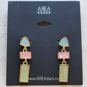New - Area Stars Costume Jewelry - 3-Part Ceramic Colored Drop Earrings with Post Back, Metal is Gold Tone with Green, Pink, Blue Ceramic Insets on Earrings.
