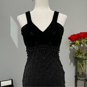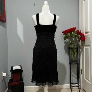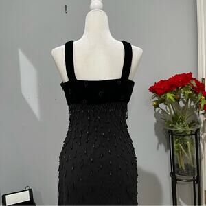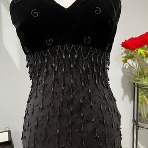 New without tags Stunning Vintage 90s Great Gatsby Hand Beaded Black Chandelier Drop and Clear Sequined Paillettes Silk and Velvet Structured Midi Flapper Evening Dress by Argenti. Romantic Plunging V-neck Halter Style Upper with Wide Velvet Straps. Chandelier Drop Beads Vary in Length. Hand Beaded Swirls on Velvet Bust. Side Zipper Closure. Empire Waist. Semi Full Skirt with Flutter Hem. Black. Women’s Size 8.