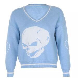 NEW blue v neck long sleeve skulls and hearts on argyle academia sweater! White trim and graphic skulls and hearts super soft sweater!