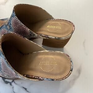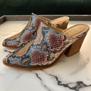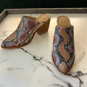 NEW Arider Girl multicolor snake skin slip-on western style mule booties. 2.5" leather stacked block heel. Pointed toe. Vegan leather upper. Size 6.