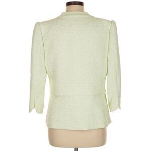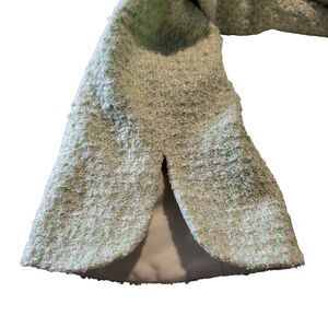 An elegant, shimmering designer jacket that can be worn year round for dressy occasions, to the office or casual occasions. The material is a textured, woven tweed-like fabric with clear buttons which reflect the green in the material. The mint green is perfect for spring and the shimmer is perfect for any holiday.