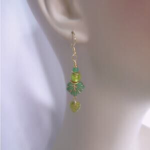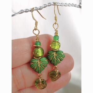 NEW Artisan Fall Green Earrings Dangle Autumn Czech Glass Golden Accent Elegant
