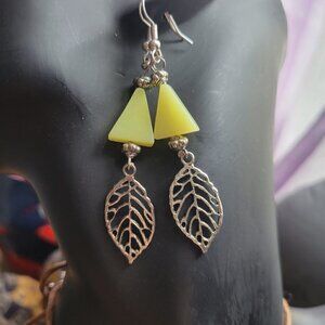 ●Beautiful Green/ lime coloring triangle peice layered with other silver accent beads and at the end dangling is a silver leaf