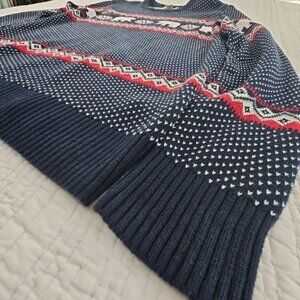 This Men's Aspen Winter Theme Sweater in size Medium features a navy blue and red color with a graphic print of a polar bear, perfect for the holiday season. The sweater is made of cotton with a tight-knit fabric, making it ideal for winter activities like skiing and hiking. It has long sleeves and a crew neck, offering a comfortable fit for casual occasions or parties.