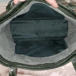 SUPER NICE Women's Assots London AGNES brand Forest Green Croc 100% Leather Satchel Handbag Top Handle Purse, Attached/Non-Adjustable Double Handles, Top Zipper Closure, Rectangle Bottom, Outside Side Pockets and NO Inside Pockets.