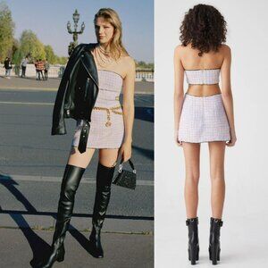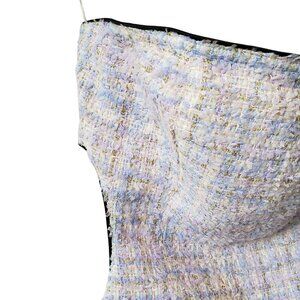 Strapless, tweed mini dress featuring cut-out back detail and invisible zip closure. Beautiful lavender pastel color combination in tweed with metallic thread throughout giving is a gorgeous sparkle that is difficult to capture in photos. New with tags!
