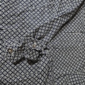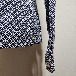 New with tags from Stein Mart, Attyre New York women's geometric damask lightweight denim jacket with long sleeves and silver gem hardware. Elevate your wardrobe with this stylish geometric patterned top. Perfect for any occasion, this top features a classic black and white design that pairs effortlessly with any outfit. Size L, chest measures about 21".