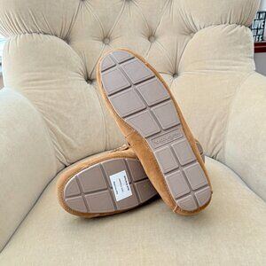 The slip-on style features a faux fur/wool lining and suede upper material in a rich Chestnut color.