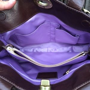 Coach brown leather hobo handbag with gold-footed bottom, magnetic upper with gold buckle, and immaculate lavender silk lining with lots of compartments and pockets. Brand new, never used! Handles are 7.5" long and the entire handbag is 10x15" with a 5" base width. #E0969-13914.