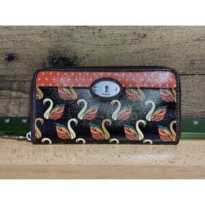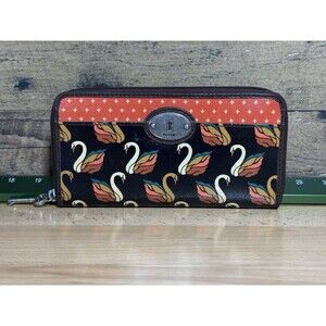 NEW Authentic Fossil Key-Per Brown/Orange Swan Print Card Wallet Fall Colors