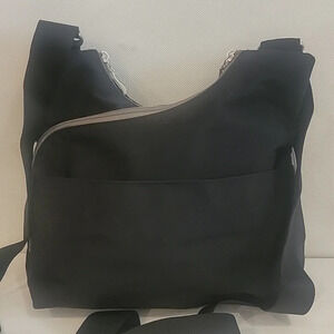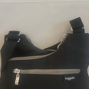 New without the tags, Baggallini criss-cross handbag with a crossbody strap. There are 3 compartments. 2 compartments zipper and the 3rd has a magnetic closure. There is a zippered pocket on the front of the bag and a slide pocket on the back. Please see all pictures.