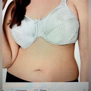 Bali floral satin minimizer with comfort cushion straps. Color support. Satin tracing minimized. Underwire . Style 3562. 40 C 100 white. Hand wash warm water. Hang dry, no bleach. Fabric contents; cup, Side, back, center and front strap Linings front sling and center front strap 89% nylon 11% spandex. Back 71% nylon 27% spandex exclusive of other elastics and decorations.New with Tags. Triple clasps in back with triple choice to size.