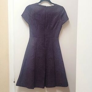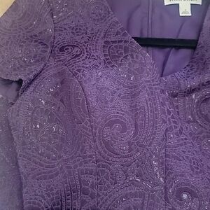 New without the tags - A beautiful dark purple damask short sleeve dress with a V neckline.  There is  a hidden zipper down the back.  The dress has 3-1/2" pleats.  Measurement from underarm to underarm across the front is 16-1/2".  The dress is lined.