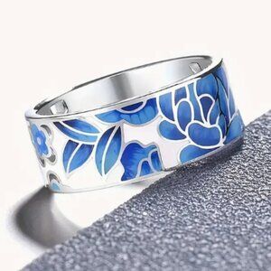 NEW BAND RING BLUE WHITE SILVER PLATED ABSTRACT ART FLOWERS SZ 8 GIFT FOR HER