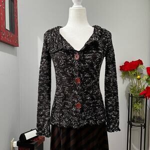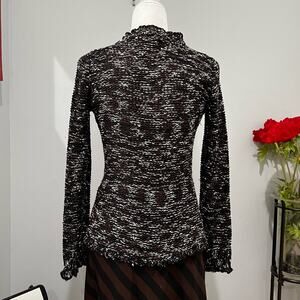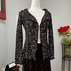 New without tags BCBGMAXAZRIA Open Weave Knit Chocolate Brown and Black Melange Multi Flutter Collar Button Down Longline Cardigan Blazer Jacket. Ruffle Flutter Neck, Cuffs, and Hem. Large Wooden Buttons. Collar Drapes into a V-neck when Unopened and a High Ruffled Neck when Buttoned. Size Small. New, no tags.