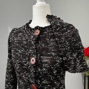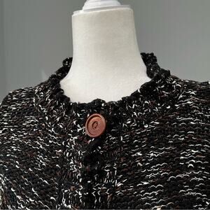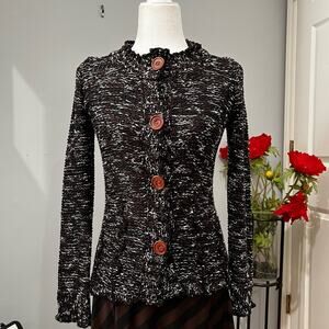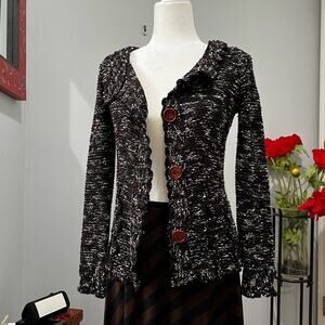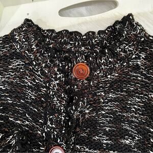 New without tags BCBGMAXAZRIA Open Weave Knit Chocolate Brown and Black Melange Multi Flutter Collar Button Down Longline Cardigan Blazer Jacket. Ruffle Flutter Neck, Cuffs, and Hem. Large Wooden Buttons. Collar Drapes into a V-neck when Unopened and a High Ruffled Neck when Buttoned. Size Small. New, no tags.