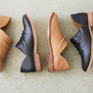 Deconstructed vegetable-tanned leather ankle boot. Fully leather lined. Features a leather sole with molded arch support for extra comfort and wearability.