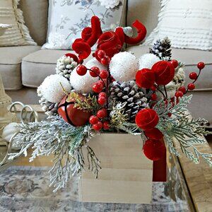 New and I am in LOVE with how this piece turned out. What a great gift to give this holiday season. I have taken a wood box and created this floral with LOTS of QUALITY stems as shown. There is also a faux snow ornie attached that just completes this piece. Velvet ball ornies, flocked greens and pinecones, jingle bells, berries, glittery snowballs and more. Measures finished size 16" wide x 11" deep x 13" tall. Floral price is firm due to posh's 20% fee. WEIGHTY AFTER PACKING MAY OR MAY NOT BE BUNDLED PLEASE INQUIRE. There is a 5 lb max limit AFTER packing materials and box for flat shipping rate. PRICE REFLECTS PACKING MATERIALS SUCH AS A MOVING BOX, BUBBLE WRAP, PACKING MATERIALS AS WELL AS POSH'S 20% FEE. DISCOUNTS ARE OFFERED ON 3 OR MORE ITEMS PER SALE EVEN IF SPLITTING BUNDLES. Smoke free ty for poking in my closet xo