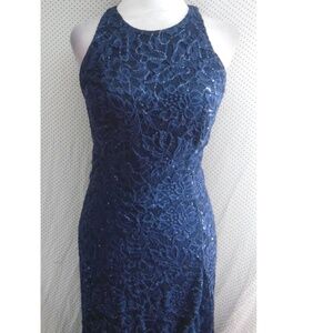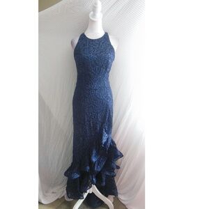 NEW BETSY & ADAM Navy Blue SEQUINED LACE Ruffle Hem TIERED Evening Dress GOWN