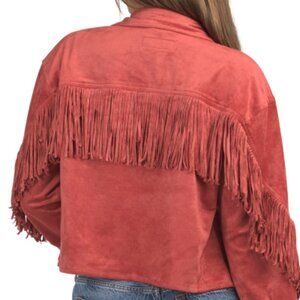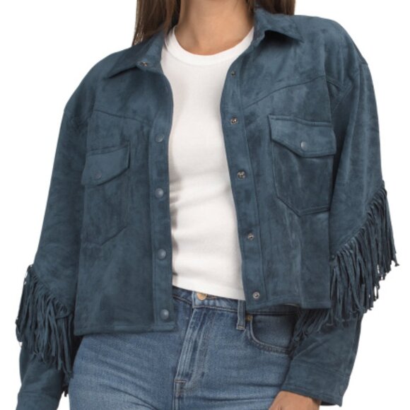 Elevate your everyday style with this BLANK NYC faux suede fringe jacket. Designed with a modern cropped fit that hits at the hip, this lightweight jacket features fringe detailing along the sleeves for a bold western-inspired look. Made from a soft faux suede fabric with stretch, it offers both comfort and style, making it perfect for layering year-round.