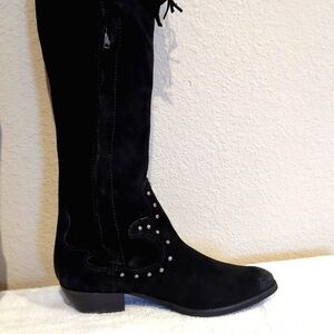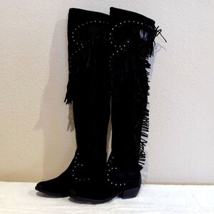 NEW BOHO Chic Tonto Fallz Over Knee Fringe Leather Black Suede Boots. Size 6.5. These Naughty Monkey Over The Knee Boots are gorgeous and super trendy! Bohemian Vibes!! Rounded Toe. Heel measures 1 1/2". Shaft measures approximately 22". Beautiful Fringe and Grommet Detail. Side Zip Closure. Lightly Padded Footbed. Comes with two (2) original boot bags. Excellent NEW Condition. No Flaws.