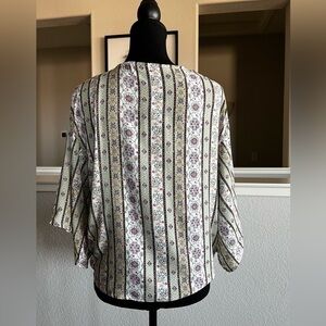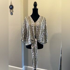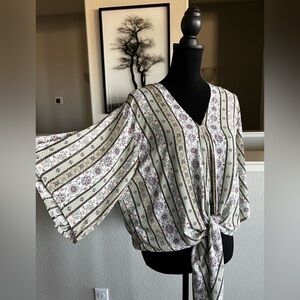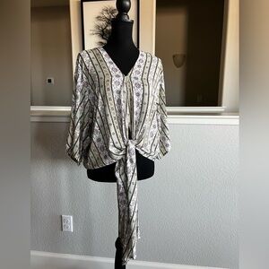 Super cute boho print tie front blouse. The colors are awesome with greens and purple. New with tags. Size small.