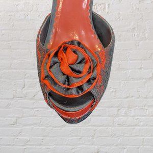 These never-worn shoes are TO DIE FOR...exquisite red satin stilettos, designed to make you feel sexy and daring with every step! These captivating red shoes feature a black lace overlay, adding a touch of elegance to their already irresistible charm. The ankle strap ensures a secure fit, while the rose detail on the peep toe enhances their feminine allure. With a platform for added height, these shoes are truly art to be worn.