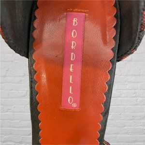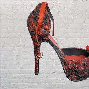 NEW BORDELLO -- Platform Stilettos, Red Satin w/Black Lace Overlay, Peep Toe
