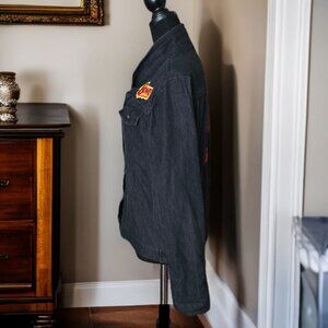 NEW BOWIE (LG) Black Denim Embroidered Metal Button Up Stretch Bomber Jacket